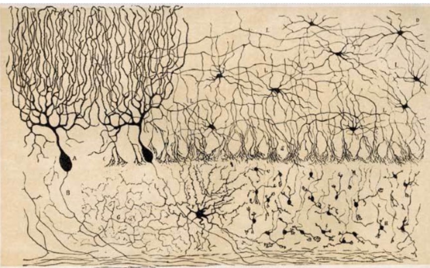 サンティアゴ・ラモン・イ・カハール(ラモニ・カハール)は、ゴルジ鍍銀染色法によって、個々の神経細胞の形を可視化し、皮質では、神経細胞が5,6段の層状に配列していることを明らかにした(図3 -4)。コルビニアン・ブロードマンは、大脳新皮質の全体について、この層状構造を詳しく調べ、領域によって異なる層構造であることを明らかにし、異なる構造を持つ領域を、50以上の番地を付けて区別した。それぞれの領域は異なる脳機能を持つと考えられるが、多くの高次機能が、似たような層構造に依存したものだ、とも考えることができる。電気生理学の発展により、個別の神経細胞の活動性が明らかになり、神経回路の組み合わせと思われる脳の論理的な思考というものを、細胞レベルから理解しようとする流れが起こる。