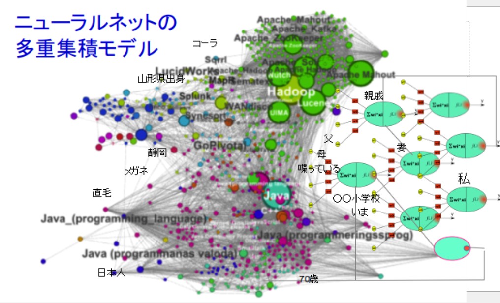 記憶がNNのスクラムの上に載せられていると理解すれば、アイスクリームとソフトクリームは、似た者同士なので、同じNNの配線体を使って区別して認知されるるであろう、ということになる。そのときに反応するNNの中の細胞群は、おそらく、各層において類似の分布パターンを示すであろう。両者を最終的に区別する第3層の2つの出力細胞は、互いに近い所に存在している確率が高いであろう。シュークリームやクリームソーダなどの他のクリームを代表する、それぞれの神経細胞たちは、互いに近い分布域に散らばっていると考えてよいであろう。見たり、聞いたり、触ったりして判別されるもの、あるいは、認知されるものは、感覚に応じて、脳内の一定の所にある神経細胞が反応するか、しないかによって、判別されるものと考えてよい。それらが、実際に脳皮質のどの場所に存在するのかということは、個人の経験と教育の時と場所によって、それぞれ異なるのは、自然なことであろう。