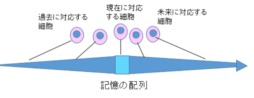 これらの論文は、海馬の神経組織内に、起こったことの間の数秒の時間間隔に対して発火するような神経細胞がある、ということを報告している。意識がすぐに認識できるような範囲の時間差を、計測するような仕組みが存在するわけである。こうした神経細胞があれば、昨日と今日のような時間差を認識するような細胞ができることはすぐ想像できる。ただ、ちょっと前、だいぶ前、大昔などという、ざっくりした時間の前後を区別するのは、事柄をグループ分けして、記憶するという、分類機能によってなされているのではないかと想像する。時代というグループわけのための概念を作り、あの事件は〇〇時代に起こったことだと記憶すれば、歴史の流れとしての世界を、頭の中に、コピーとして保存することができる。場所細胞と違って、時間細胞は、時間差を与えるだけで、定量的な情報である。方向という定性的な情報が無いため、時間が1次元のものとしてしか認識できないことになる。