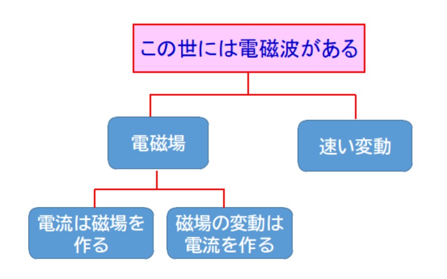 イギリスの理論物理学者、ジェームズ・C・マクスウェルは、マイケル・ファラデーやアンドレ=マリ・アンペールらが発見した、電気や磁気に関する法則を数式で表し、その数式を数学的にまとめることによって、電磁波(電波)の存在を予言することができた。式に含まれる自然定数である誘電率と透磁率から、この波が伝わる速さまで計算され、それは当時すでに知られていた光の速度と一致した。このことから、光のひとつの形として、電波という波が存在し、光も電波の仲間のひとつなのだ、ということが理解された。人間の脳が達成した、最大の科学的な成果である。実際にその過程を辿るには、電気・磁気に関する微分方程式と波動のベクトル方程式の数学を理解していなければならないが、下図のように、簡単な言葉を並べるだけでも、ある程度の理解はできる。電波は、マクスウェルの予言の後に、ハインリヒ・ヘルツの2台の誘電コイルを用いた実験によって、実在することが証明され、グリエルモ・マルコーニによって、実際に大西洋を越える通信に応用できることが示された。