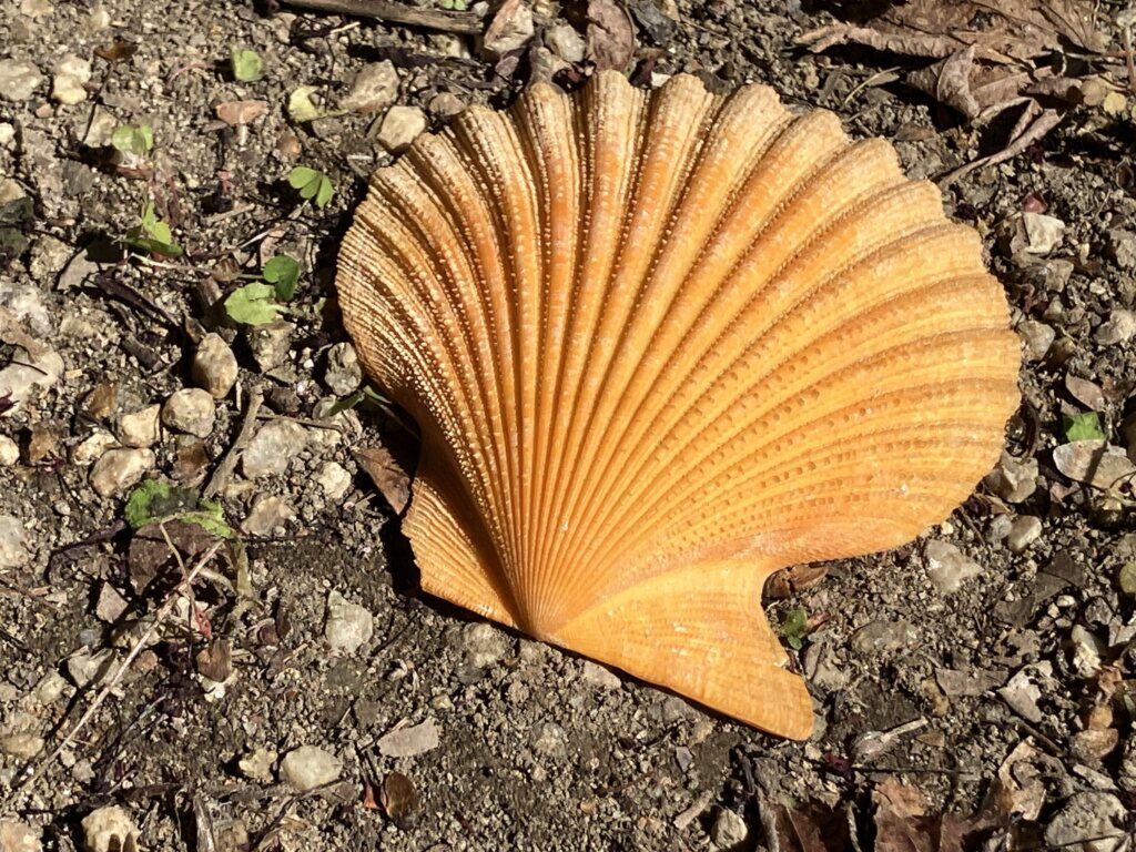 ホタテの殻を背に人々が巡礼する聖地