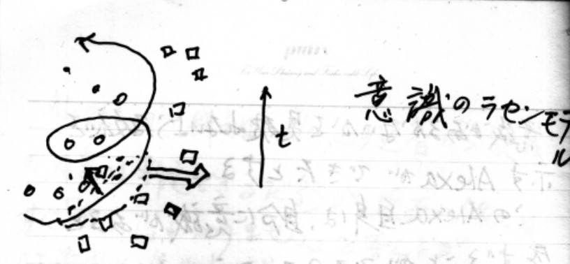 自分の生まれ、育ちなどの基本的な事項は、常に意識の底にあり、自己から切り離されることはない。「現在」を規定する記憶(のニューロン群)は、図では、3次元の円環体の形に近い分布を持ち、時間軸tに沿って、ぼやけた尾を曳きながら、下から上に移動していく。現在を作るのは、実際は10秒前後の時間幅で広がっている記憶ユニットの集まりだ。この現在を作り出す記憶群から、自動的な働きによって、言葉が作られる。例えば、「歯を磨いたらすぐに家を出て駅に向かわないと遅刻だ!」。この言葉は、指令記憶ユニットへ送られ、次の動作を決定するトーナメント・ユニットを通過して、”自動的に” 行動が進む。トーナメント・ユニットとは、(浮かび上がる多数の想いを比較して、何が今なされなければならないか、という選択競争の勝者を判断するニューラルネットである。意識は前面に出ていなくてもよいのだ。意識は、自分の行動が進んでいくさまを、連続的に記憶するという作業をしていればよい。駅に着いた頃には、指令記憶ユニットの内容は次の言葉に置き換えられている。いわく、「上り線のホームへ行く」。意識と思われる自己感覚は、1秒くらいの時間幅に収まっている。しかし、そのときの感覚は、多くの場合は、かなり長い言葉のセンテンスであり、それが1秒くらいの時間幅で意識に湧き上がることができる。こんな時、他人が「今、どんな気持ち?」と問えば、記憶ユニット群が即座に反応して、言葉を作り出し、質問者に応えることができる。「今、急いでいるョ!」