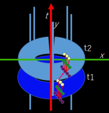 しかし、このモデルでは、X-Y軸の意味がはっきりしない。意識の変化を全体としてラセンの動きの中で捉えていたが、1,2秒の速い変化が時間軸に沿っていない点が、問題に思われる。記憶ユニットの中で変化が進行していくのは、やはり時間軸に沿っている方が、合理的である。そこで、意識の塊(点線で表示した円環体)を形成している記憶ユニットの集積を、環状のものに拡げて、変化が時間軸の縦方向に伝わる様に考え直す。すると、より具体的に大脳皮質の全体をモデル化することができる。